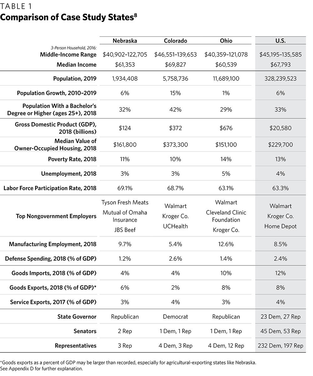 There are many different definitions one could employ to define the middle class. These case studies focus on households falling within the middle-income bracket, defined by the independent, nonpar- tisan Pew Research Center as two-thirds to double the median income, adjusted for household size and local cost of living. Table 1 shows the middle-income ranges in Ohio, Colorado, Nebraska, and the United States. The term middle class connotes more than income alone, however. Many also associ- ate this term with the dignity of work, position in society, and/or the maintenance of a certain lifestyle. Those interviewed for the project often described a middle-class lifestyle as the ability to secure a job with adequate pay and benefits to meet their monthly expenses, tend to their families’ medical needs, buy a car, own a home, help their kids pursue decent postsecondary education, take an annual vaca- tion, save for retirement, and not be saddled with crippling debt.